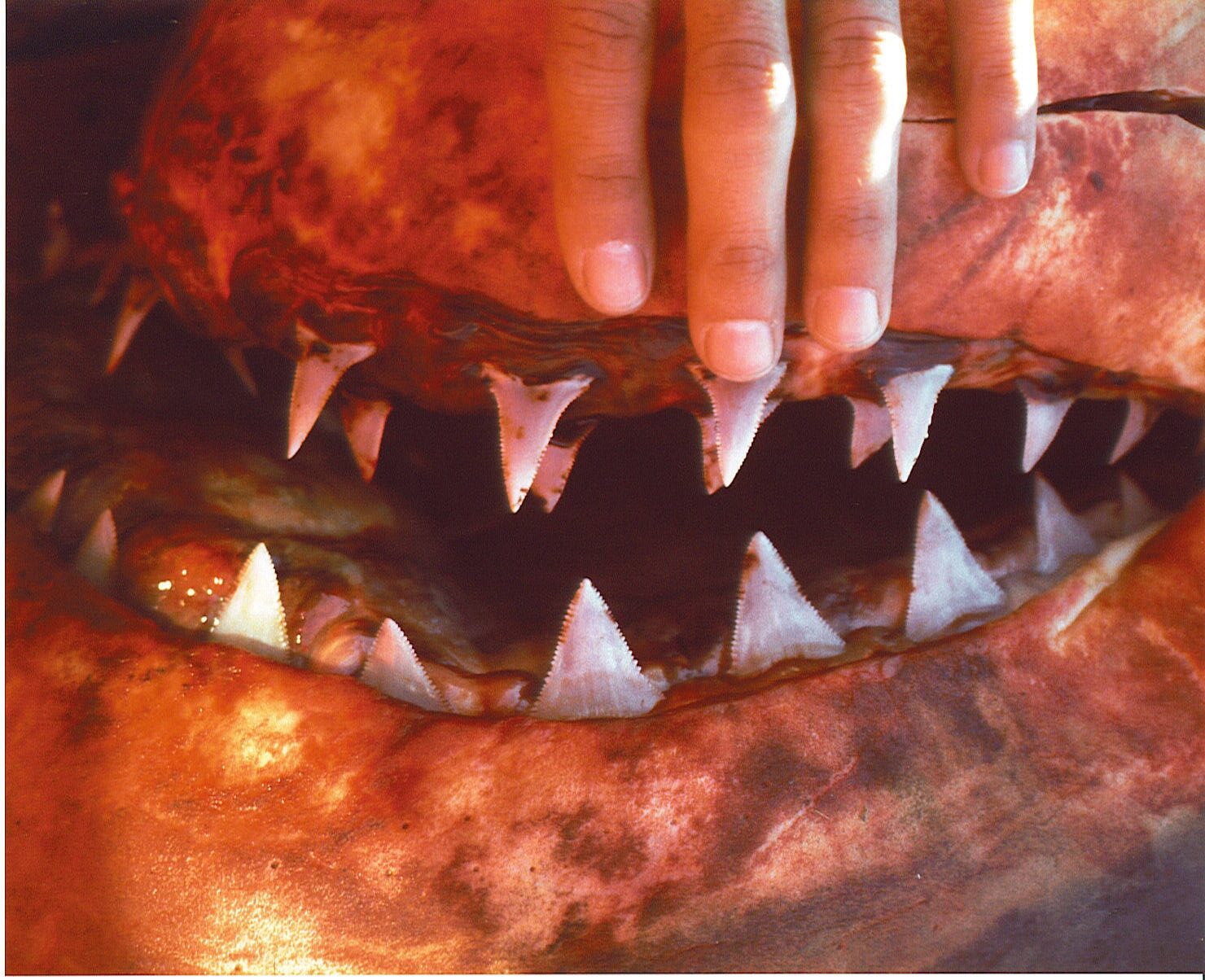 White Shark and author’s hand for scale. Note pores around mouth, which are electrosensory organs. Photo by R. Douglas Fields